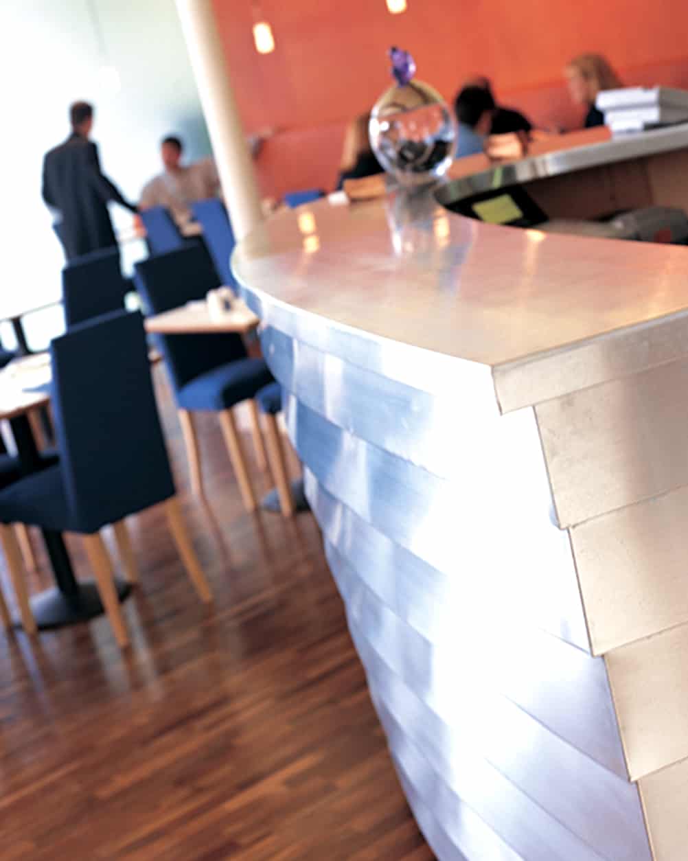 Lighting was a key feature with almost all surfaces used as illumination devices – walls, ceiling fins screens and the bar combined to create a variable atmosphere depending on the time of day. This warm, bustling and atmospheric city restaurant by day changed into a club atmosphere by night.